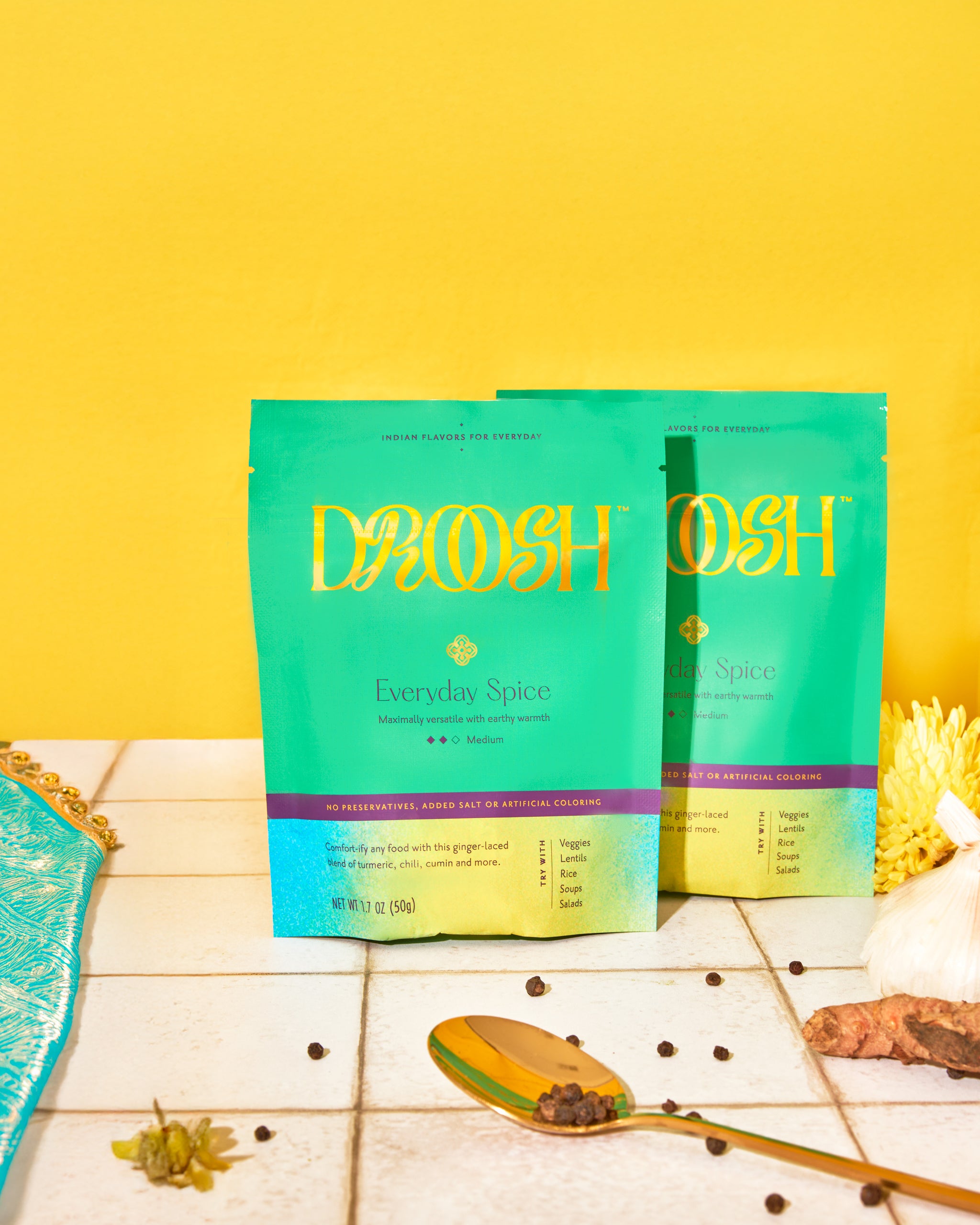 - Add to dishes like veggies, soups and lentils while they're cooking, or sprinkle a hefty dash on a salad before you give it a good mix. Use this as a marinade or dry rub on tofu or paneer. Make a paste by mixing equal parts oil, water and the spice together, and add to curries and sauces while they’re cooking. Add a pinch or tablespoon to a pre-made meal or take-out dish that is lacking flavor. Check out The Pinch for more recipes that use the Everyday Spice and share your own by tagging @shopdroosh.